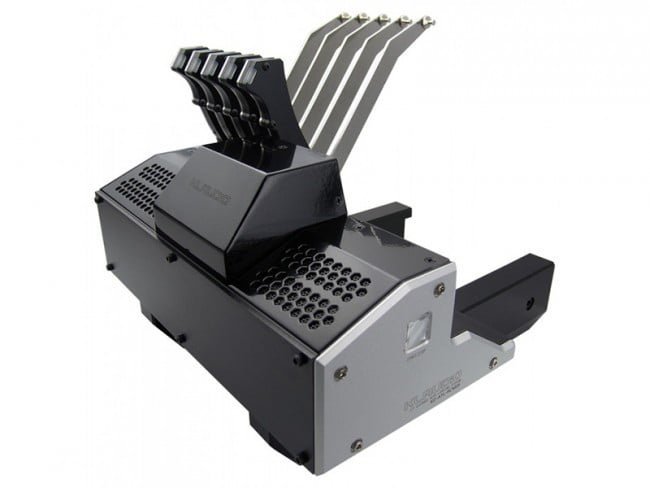 Klaudio’s disc loader queues up to five records for automatic cleaning and drying. Each LP is lowered and raised with a motorized arm, and its status is displayed by an LED (red=dirty, green=clean). Records can be exchanged continuously, so there’s no need to wait for all five discs to finish. The auto-loader will track the cleaning status and location of newly added discs.