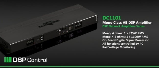 The DC1100 is the DC Series Big Boy. It gives you 825 watts RMS at 4 ohms and 1100 watts RMS at 2 ohms. And those are Zapco Class A/B watts with all the digital processing of the DC series, so you’ll have 10 bands of parametric equalization just for your woofer. Can you say Perfect Bass?