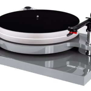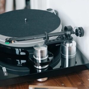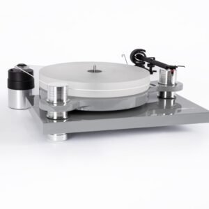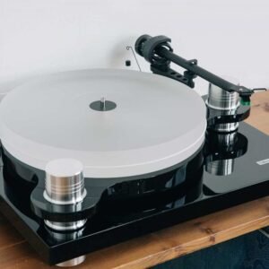 Il PS-100+ è una gemma tra i giradischi, unendo qualità superba ad un prezzo ragionevole! È alimentato da un motore esterno da 1,5 kg, capace di girare a 33 e 45 RPM. La struttura è un capolavoro di ingegneria, con un telaio in MDF lucidato e basi in alluminio solido e rifinite con cura artigianale; poggia su piedini che si possono regolare. Elementi come il piatto in vetro acrilico, il tappetino in feltro e il leggerissimo braccio di tono da 11,5 g (supportato da un contrappeso di 65 g e un peso anti-skating) ne fanno un gioiello che si potrebbe aspettare di trovare solo in dispositivi che sfiorano i 2000 euro. Un altro tocco di genialità: il braccio di tono, anziché essere ancorato con supporti poco gradevoli alla vista, è tenuto in posizione di riposo attraverso un sistema magnetico, garantendo un’estetica pulita e un funzionamento impeccabile. Il PS-100+ viene con il sistema Ortofon OM5E già installato e calibrato. Inoltre, nella confezione troverai un cavo Chinch con connessione a terra e un paio di guanti di cotone per un’installazione curata.