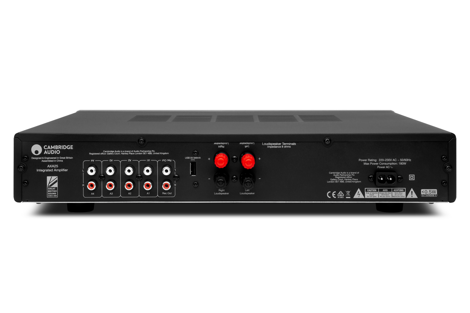 POWER OUTPUT 25 Watts (into 8 Ohms) THD (UNWEIGHTED) <0.015% @ 1kHz, 80% of rated power <0.15% 20Hz – 20kHz, 80% of rated power <0.1% 20Hz – 20kHz @ 10W FREQUENCY RESPONSE (-3DB) (-3dB) 10Hz – 30kHz S/N RATIO (REF 1W) >82dB (unweighted) INPUT IMPEDANCES 32k ohms POWER AMP DAMPING FACTOR > 100 MAX. POWER CONSUMPTION 180W BASS/TREBLE CONTROLS Shelving, ultimate boost/cut +/- 5.5dB @ 20Hz and 20kHz STANDBY POWER CONSUMPTION <0.5W INPUTS 4x RCA, 1 x 3.5mm Aux input (front panel) OUTPUTS Speakers, Rec Out, USB 5V power DIMENSIONS (HXWXD) 83 x 430 x 340mm (3.3 x 16.9 x 13.4”) WEIGHT 5.1kg (11.2lbs) IN THE BOX AXA25 Integrated Amplifier, Power Cable