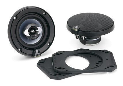 Speaker grilles are included, each consisting of a black grille tray with satin silver accents and a black steel mesh grille with an electroformed JL Audio logo.