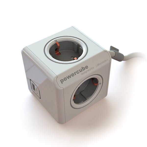 Presa multipla. 4 uscite di tipo schuko. 1 uscita USB (5V,1A) per la ricarica di apparecchi elettronici. Spina di tipo schuko con cavo da 1,5mt. Design a cubo per poter essere facilmente affiancata ad altre prese multiple allocacoc. Adattatore da scrivania e fissacavo in dotazione. Colore grigio delle prese (Trolley Grey).