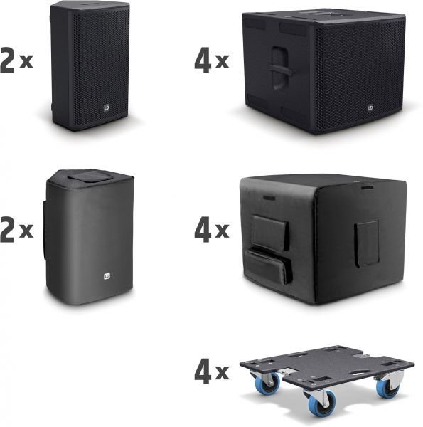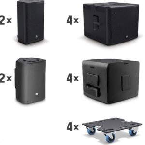 2 altoparlanti PA alimentati da 15″ + 4 subwoofer amplificati da 18″.