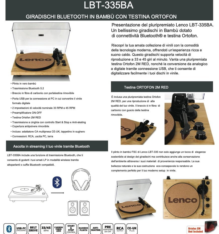 Il Lenco LBT-335 è dotato di uno zoccone in vero bambù FSC.What’s in the box?