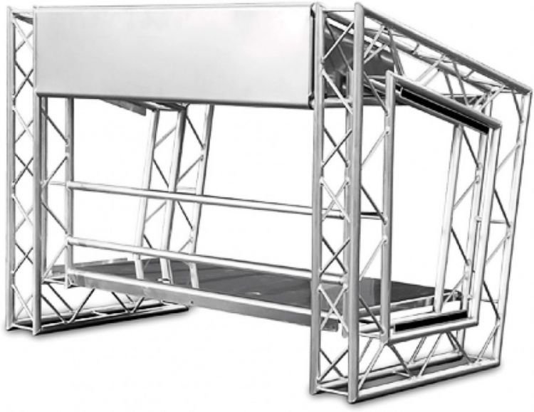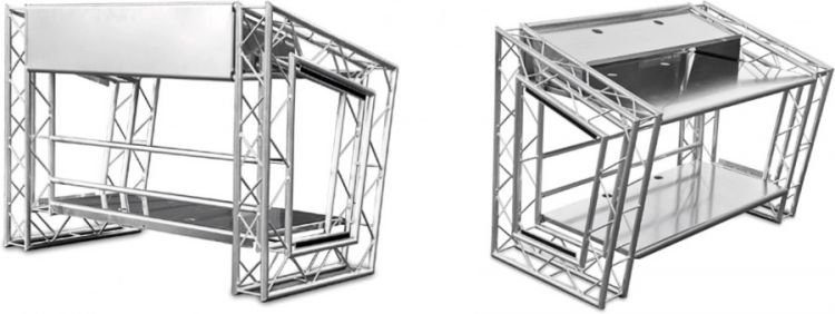 può essere espansa utilizzando un pacchetto di estensione opzionale. Ciò significa che è possibile realizzare contemporaneamente più allestimenti con un grande fabbisogno di spazio. Con un peso di 42 kg, il supporto per DJ può essere facilmente trasportato, ma è comunque assolutamente insensibile a urti e vibrazioni, una caratteristica particolarmente vantaggiosa per gli utenti di giradischi. La struttura robusta rende la console MKII un compagno affidabile e duraturo, sia per l’uso mobile su palchi grandi e piccoli, sia come console DJ installata in modo permanente nei club. Grazie al design ben studiato, il MKII può essere configurato da una sola persona in pochi minuti. Il design del traliccio si adatta perfettamente a qualsiasi ambiente scenico. La console MKII è ideale anche per l’uso negli stand fieristici o durante i dibattiti . Nella parte anteriore è possibile integrare anche uno schermo da 50″ per applicazioni multimediali. Caratteristiche