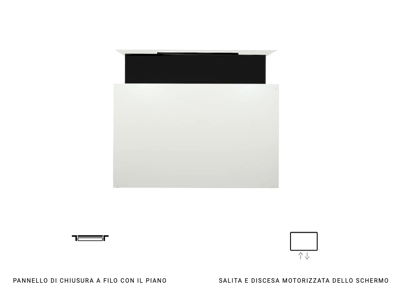 Il meccanismo di sollevamento del TV è completamente nascosto dalla struttura del mobile. Quando attivato, il supporto TV motorizzato consente l’uscita dal mobile e la salita elettrica in verticale del televisore.