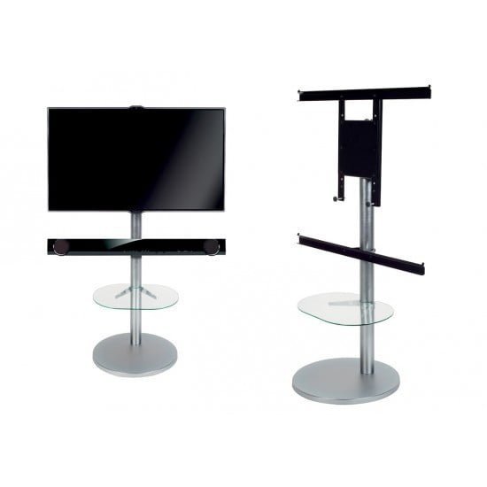 L’elegante e robusto ripiano in vetro, anch’esso regolabile in altezza, può alloggiare elettroniche come DVD player, decoder, console videogiochi etc.