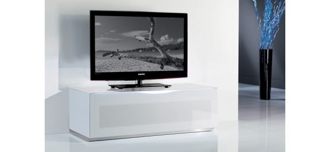 Mobili porta TV con ribalta in vetro temperato,con base con ruote nascoste o piedini d’appoggio incluso vano tecnico, illuminazione LED ed “Active Door