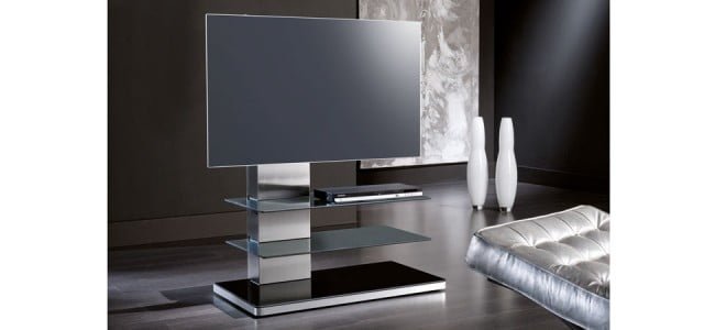 Mobili su ruote con mensole in vetro e struttura in acciaio, adatti a chi cerca una soluzione mobile organizzando i cavi, le apparecchiature elettroniche e la TV