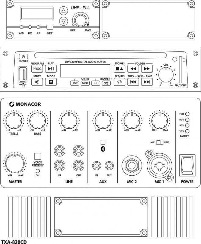 Il sistema dispone di controlli individuali per ogni ingresso, di un comando principale comune e di un controllo toni a 2 vie. Inoltre, è dotato di un circuito di priorità del microfono commutabile per garantire che la voce sia sempre in primo piano.
