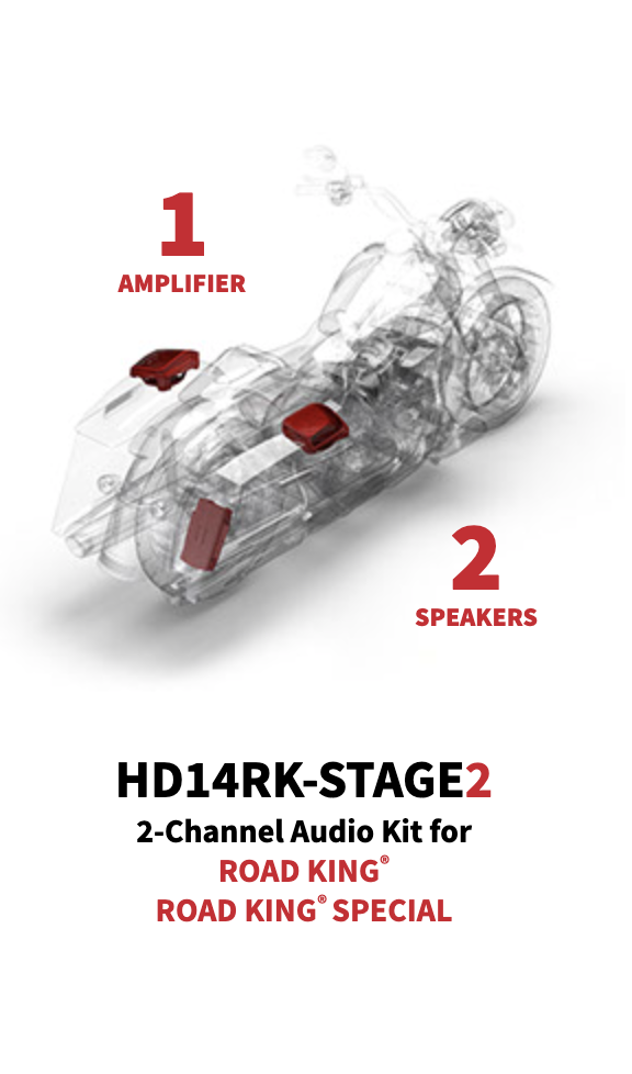 Ride con stile e potenza con il kit audio HD14RK-STAGE2, progettato appositamente per i Road King più recenti