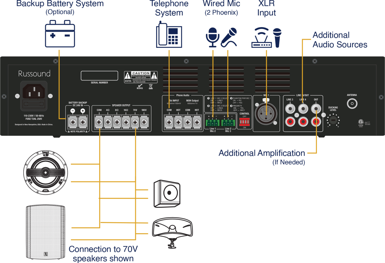 Caratteristiche principali del MIXAMP-60: Potenza di uscita nominale: 60 Watt. Uscite altoparlanti: 70V, 100V, 4 Ω, 8 Ω, 16 Ω, uscita linea RCA. Connettori: MIC 1 – XLR bilanciato con alimentazione phantom, MIC 2 e 3 con connettori Phoenix commutabili, sbilanciati e rimovibili e possono alternarsi tra microfoni o ingressi di linea. Ingresso telefonico integrato con priorità VOX e uscita MOH (Music on Hold). Controllo toni: bassi e alti separati. Pre-out per l’uso con un amplificatore esterno opzionale se è necessaria più potenza. Dimensioni: 43.5 x 9 x 26.7 cm (LxHxP). Peso: 4.3kg
