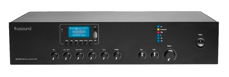 MIXAMP-60 60 Watt Mixer Amplifier Il MIXAMP-60 è un mixer amplificatore da 70 Volt /100 Volt con connettività Bluetooth integrata, sintonizzatore FM, ingresso USB, lettore MP3 con scheda SD, 3 ingressi microfonici e la possibilità di collegare fino a 4 sorgenti audio esterne. Progettato per l’uso in ristoranti, negozi al dettaglio, caffetterie, studi medici / dentistici, scuole, supermercati, minimarket e altro ancora. I comodi controlli del pannello frontale consentono un livello di volume preciso di tutte le sorgenti collegate, nonché un display LCD integrato che mostra l’audio attualmente selezionato dalle sorgenti incorporate. Indicatori LED per alimentazione, clipping, protezione e segnale. Sono disponibili l’integrazione della musica di sottofondo (BGM) e della musica in attesa (MOH), nonché un ingresso cercapersone telefonico. L’alimentazione phantom è disponibile per il microfono principale e per i livelli di ducking regolabili.