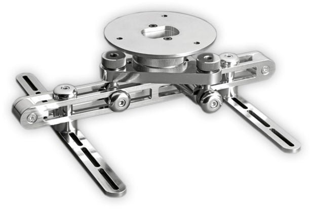 La staffa CPM1 consente una reale correzione micrometrica del piano del proiettore in modo indipendente e in tutte le possibili posizioni nello spazio. Il disegno esclusivo nasconde ben nove cuscinetti a sfere che unitamente alle tre manopole di regolazione, permettono di attuare movimenti precisi e frizionati, totalmente immuni da giochi meccanici, consentendo una estrema precisione nel centraggio del riquadro di proiezione. Grazie a 13 distinti gradi di libertà la staffa CPM1 risulta di impiego pressoché universale, sempre nel rispetto delle sue caratteristiche dimensionali e di portata (45Kg max).