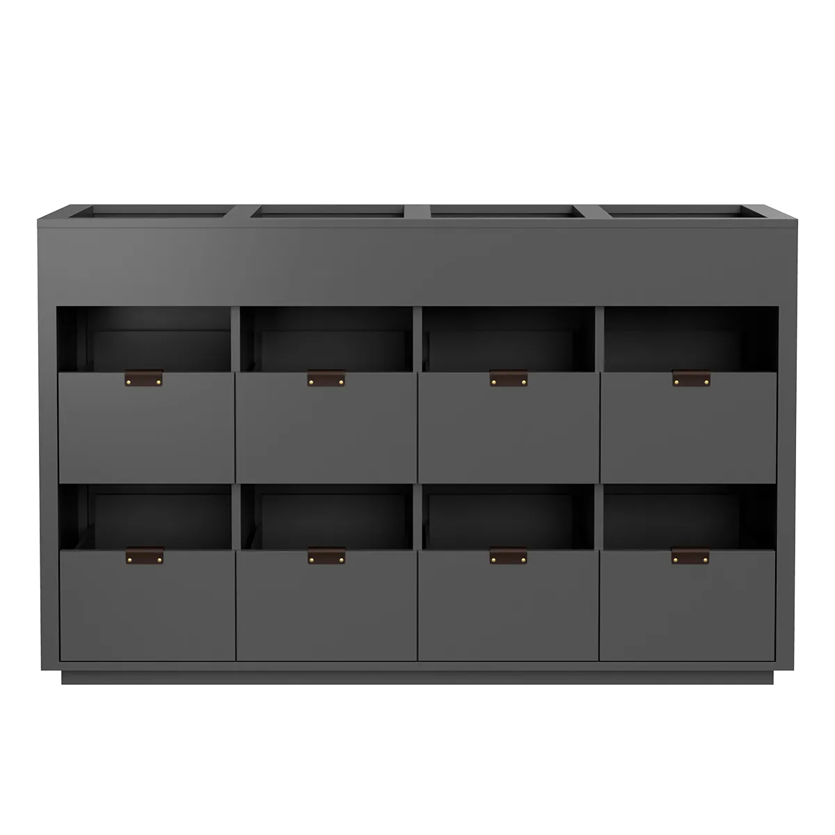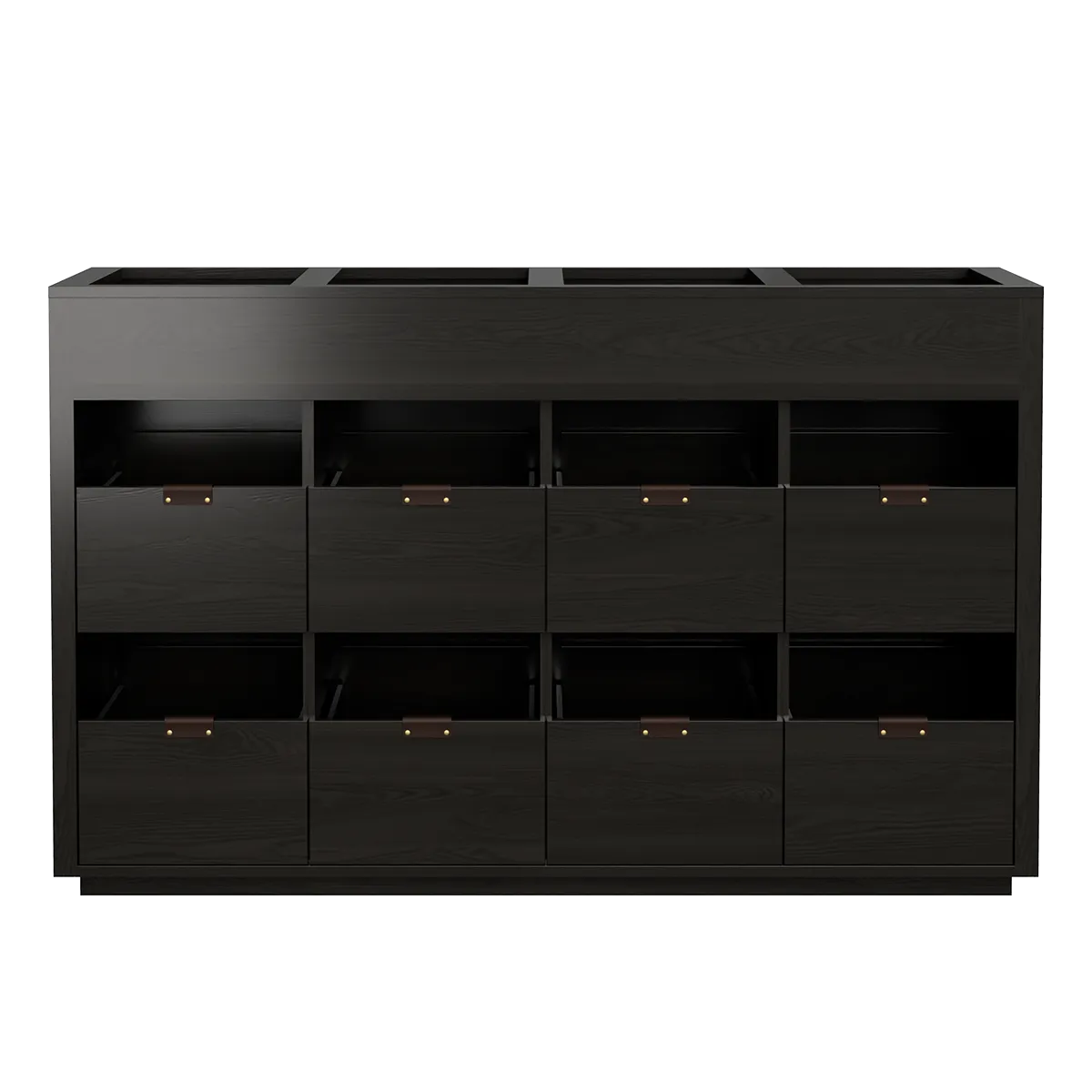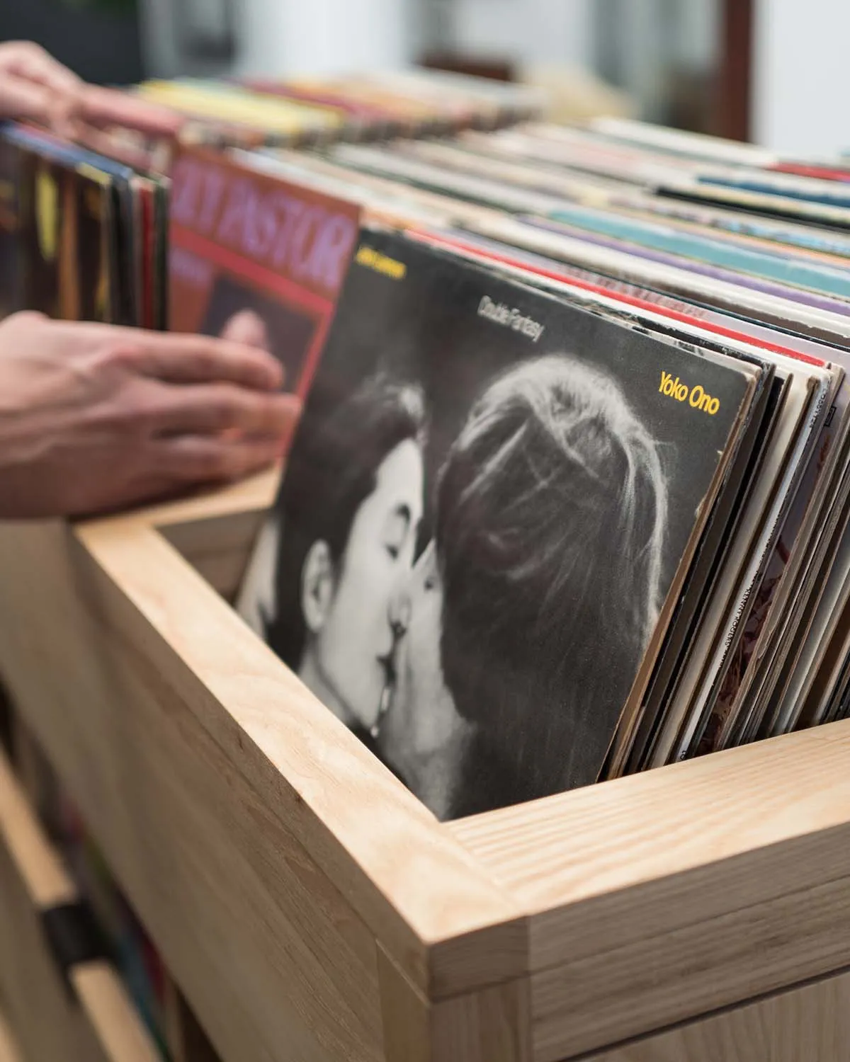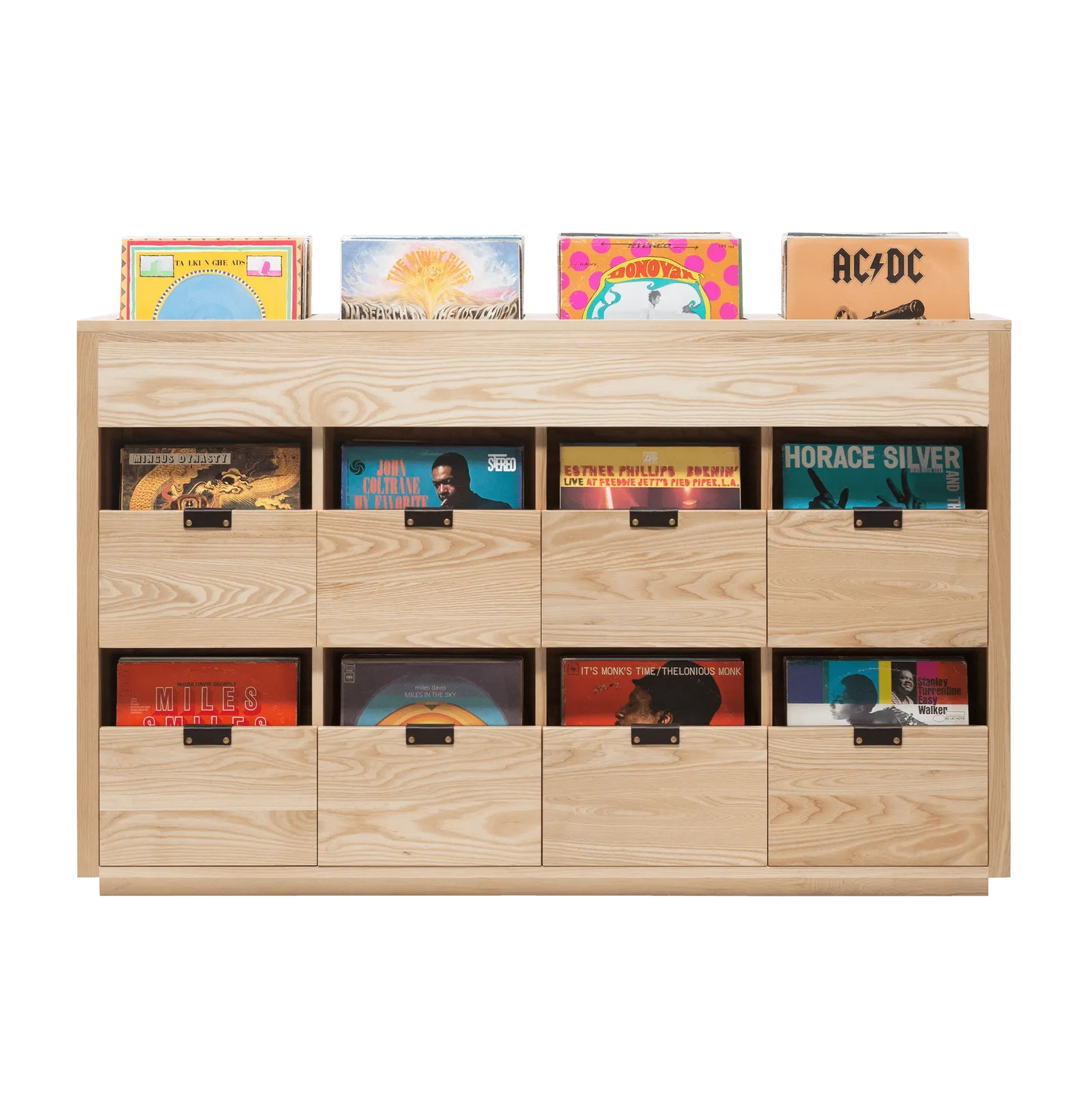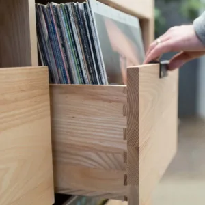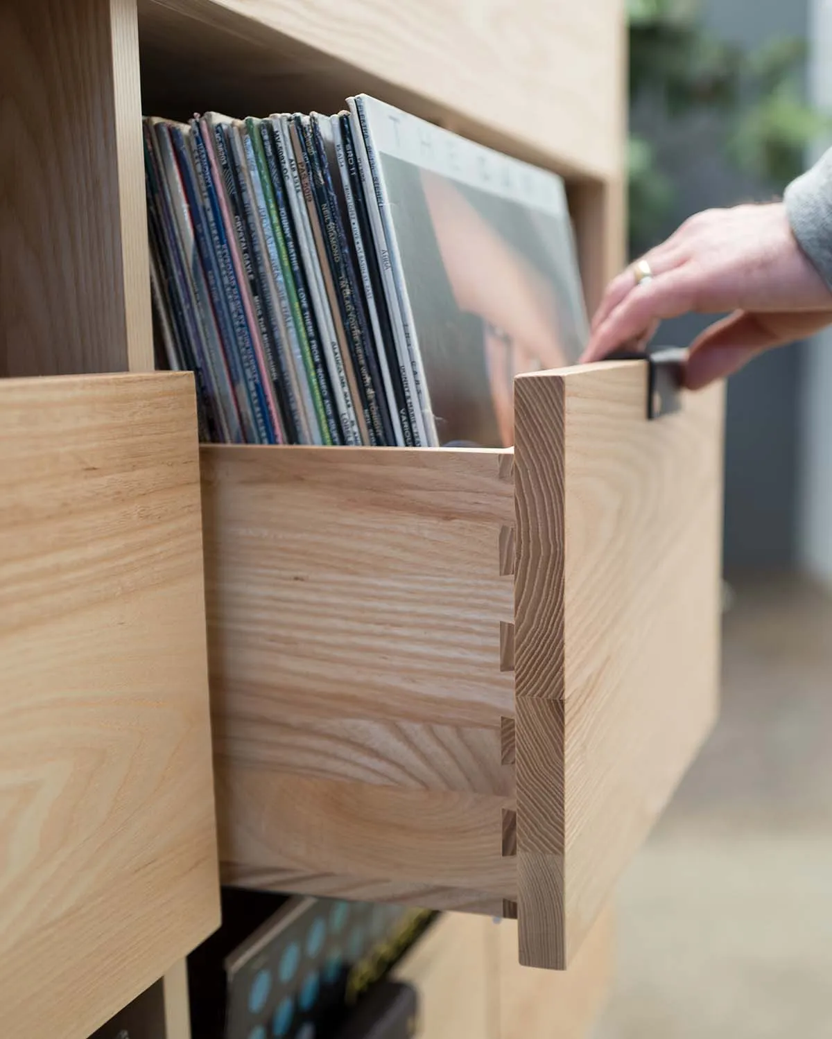 Ogni cassetto รจ costruito con la falegnameria a coda di rondine inglese a vista di Symbol e utilizza diapositive per cassetti full-extension e soft-close di fabbricazione tedesca. Ogni cassetto puรฒ contenere fino a 75 LP.