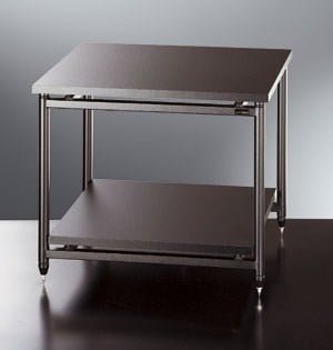 Tavolino con struttura a 4 gambe, 2 piani. Top e singoli piani in MDF, disaccoppiamento mediante coni in duralluminio per ogni ripiano.