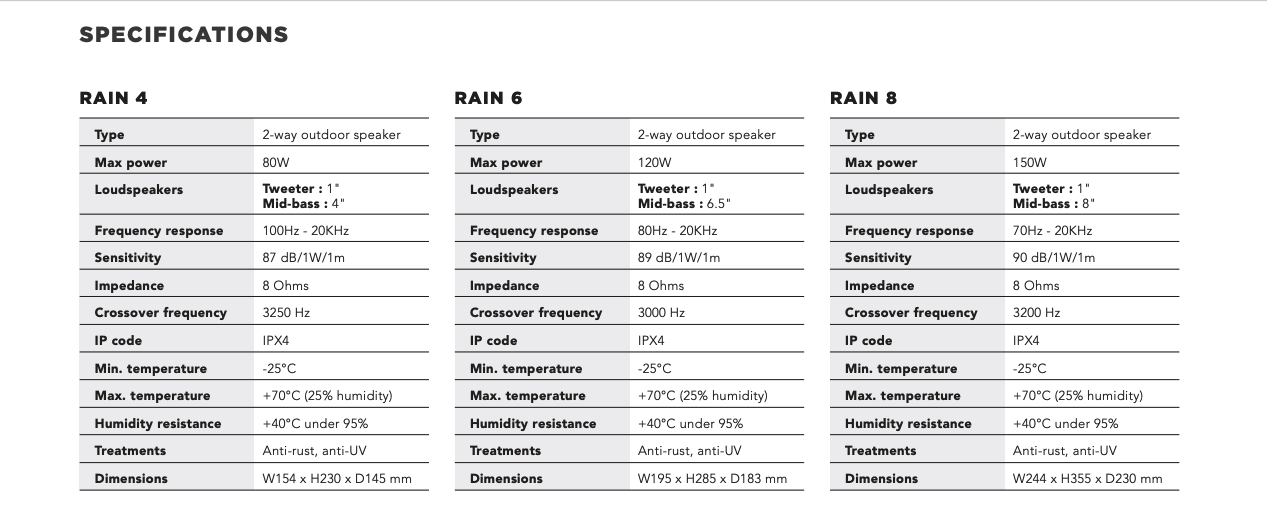 Sono disponibili tre dimensioni a seconda della quantità di potenza necessaria: RAIN 4, RAIN 6 e RAIN 8 che dispongono di un driver medio-basso rispettivamente da 4″, 6,5″ e 7,9″. Gli altoparlanti Elipson RAIN sono disponibili con finitura bianca o nera.
