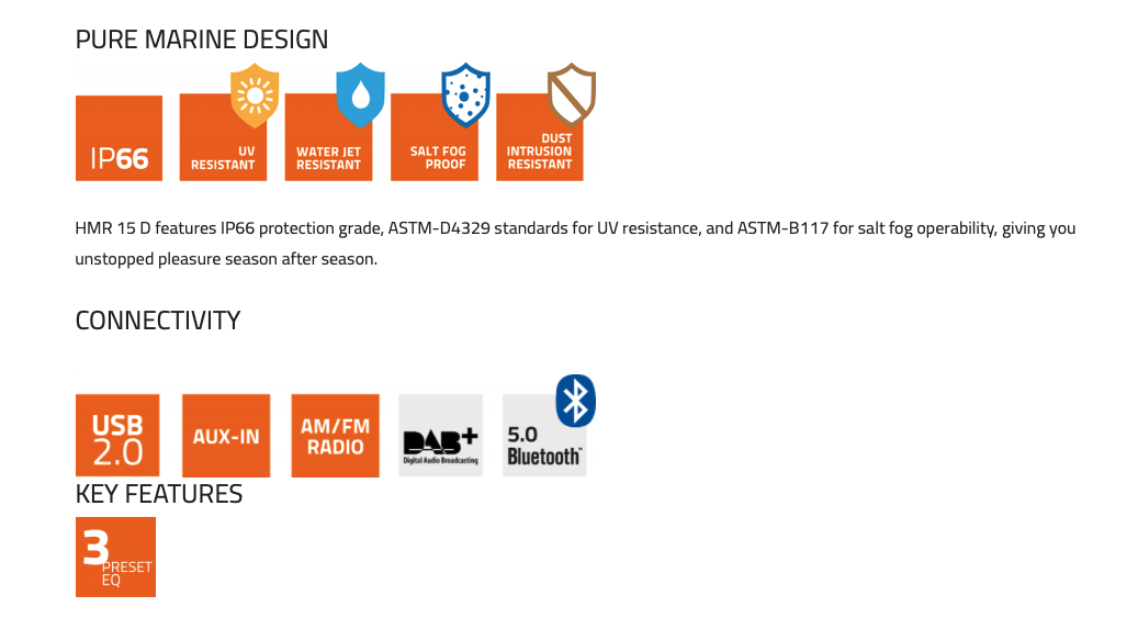 La nuova sorgente Hertz presenta un design minimalista a forma quadrata, perfettamente in linea con le ultime tendenze nei più prestigiosi strumenti di navigazione. Il centrotavola è un display generoso con il grande pannello a pulsante marine-grade distribuito simmetricamente nelle parti inferiore e superiore. Grazie al Bluetooth® 5.0 puoi trasmettere audio di alta qualità dal tuo dispositivo mobile preferito, massimizzando il divertimento in acque libere! HMR 15 D offre la compatibilità DAB + per ascoltare le tue stazioni radio preferite con prestazioni audio senza pari.