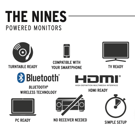 Che tu ti stia connettendo a un giradischi, a un televisore, a un computer o a uno smartphone, The Nines fornisce la soluzione. I Nines sono dotati di preamplificatore phono integrato, Bluetooth® 5, HDMI-ARC, ingressi digitali ottici, RCA analogici e USB, che consentono di godere di un suono stereo superiore da un sistema stereo splendidamente realizzato.
