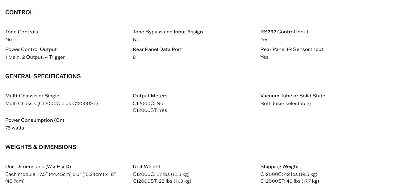 Il C12000 è composto dal modulo controller C12000 e dal modulo preamplificatore C12000. Tutti i controlli di alimentazione, le porte dati e le connessioni di controllo esterno si trovano nel controller C12000. I doppi alimentatori isolati azionano i canali sinistro e destro, mentre un doppio microprocessore conferisce robustezza al sistema di controllo. Il preamplificatore C12000 ospita le connessioni audio e i circuiti. All’interno di ciascuno, i canali sinistro e destro sono isolati elettricamente e meccanicamente l’uno dall’altro per consentire un vero doppio funzionamento mono, con conseguente massima separazione stereo e purezza sonora. Le due unità sono collegate insieme tramite una coppia di cavi ombelicali appositamente progettati e ad alte prestazioni che sono schermati per evitare che il rumore esterno fuoriesca nel segnale audio. Anche se sono due unità separate, quando sono collegate agiscono come una sola e sono facili da controllare e utilizzare dal telecomando incluso o dal pannello frontale del controller C12000.