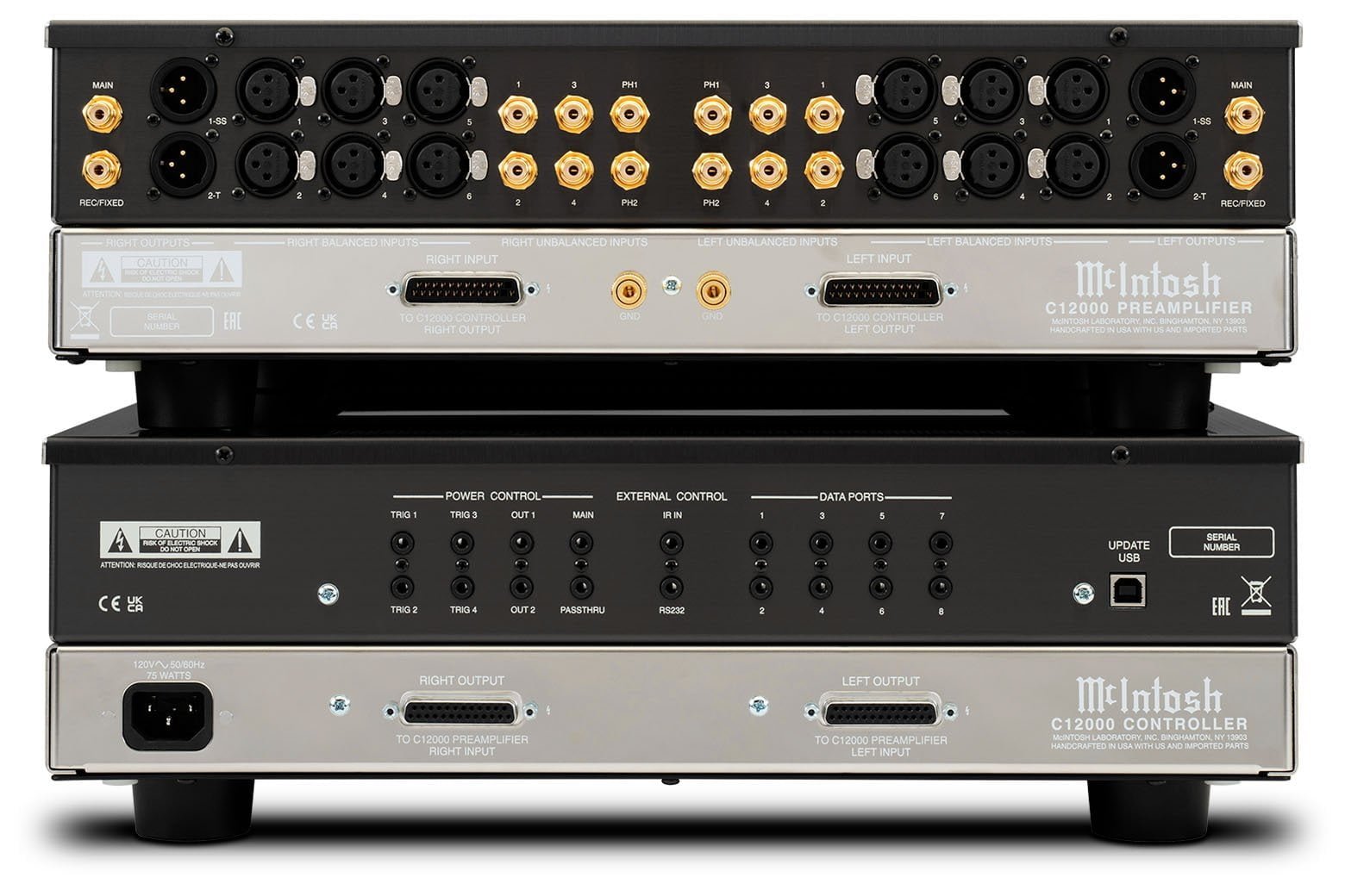 Per collegare il C12000 ai tuoi amplificatori e al resto del tuo sistema musicale domestico, ci sono quattro uscite totali: un tubo a vuoto bilanciato; uno a stato solido bilanciato; uno fisso sbilanciato; e uno sbilanciato programmabile (può essere tubo a vuoto o a stato solido). La quantità di regolazioni utente disponibili sui due ingressi phono e tutte le uscite rappresentano un nuovo livello di personalizzazione nel design del preamplificatore McIntosh, consentendo la massima flessibilità nel modo in cui si desidera configurare il sistema audio.