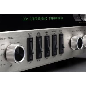 Il C22 Mk V utilizza un tubo a vuoto 12AT7 e cinque 12AX7A che possono essere visti attraverso un pannello di vetro situato sulla parte superiore del preamplificatore.