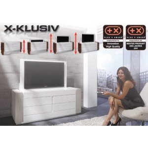 Model XXL features Apple Airplay and Bluetooth for wireless music streaming, along with a built-in FM, DAB/DAB+, and DMB radio receiver with RDS. Designed to hold up to a 65-inch flat screen placed on top, connection to a television is made using HDMI. There is interior storage with ample space for components such as a cable box, game console, or DVD player.