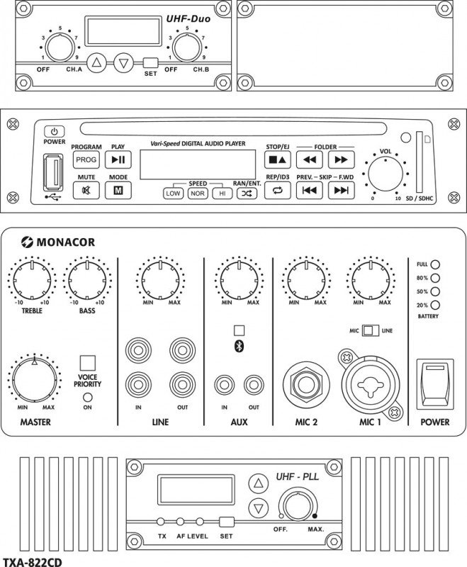 Il sistema dispone di controlli individuali per ogni ingresso, di un comando principale comune e di un controllo toni a 2 vie. Inoltre, è dotato di un circuito di priorità del microfono commutabile per garantire che la voce sia sempre in primo piano.