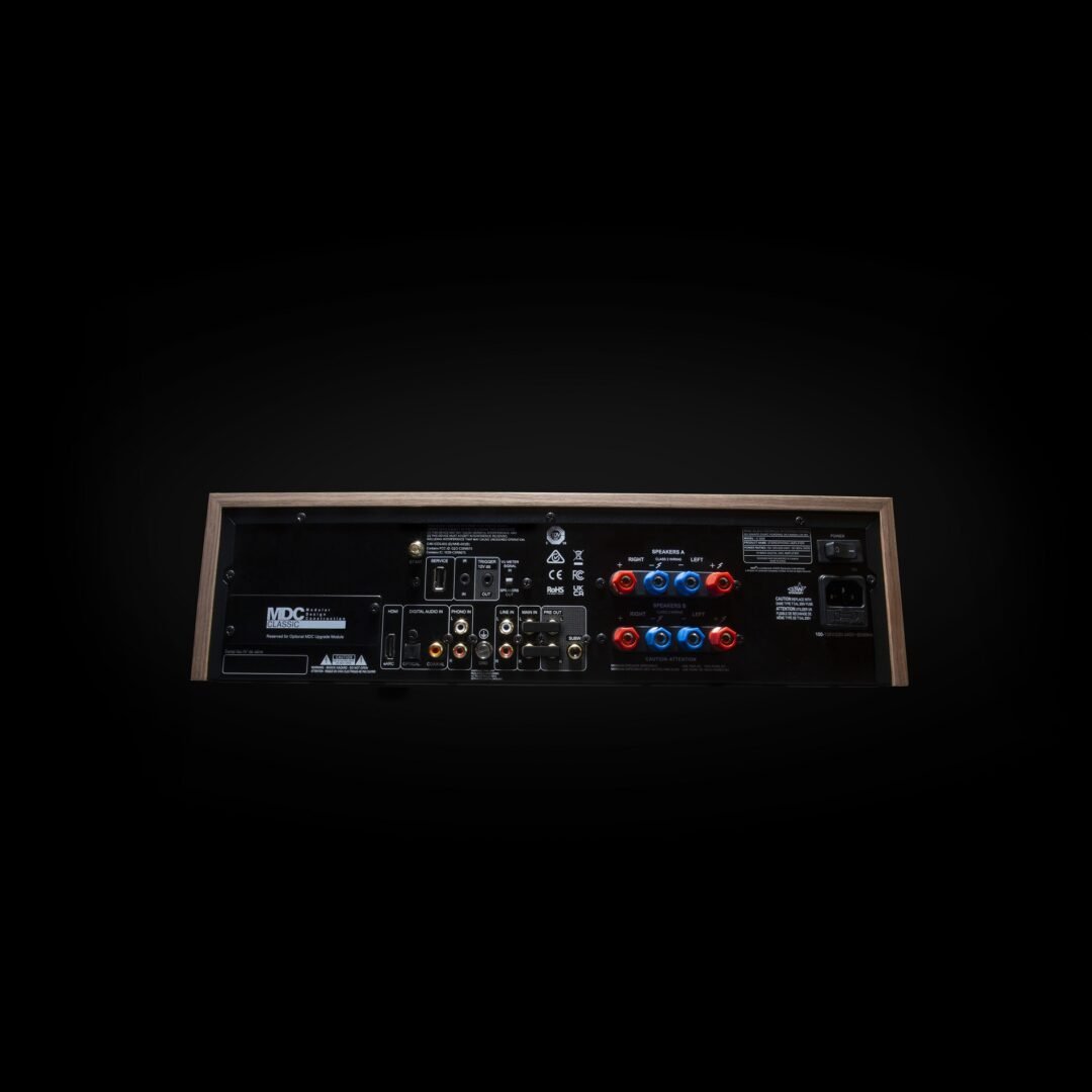 - Gli elementi di design retrò includono VU meter sul pannello frontale, controlli di ingresso a pulsante, marchio in corsivo degli anni ’70, cabinet rivestito in vinile con finitura in noce e pannello frontale grigio scuro.