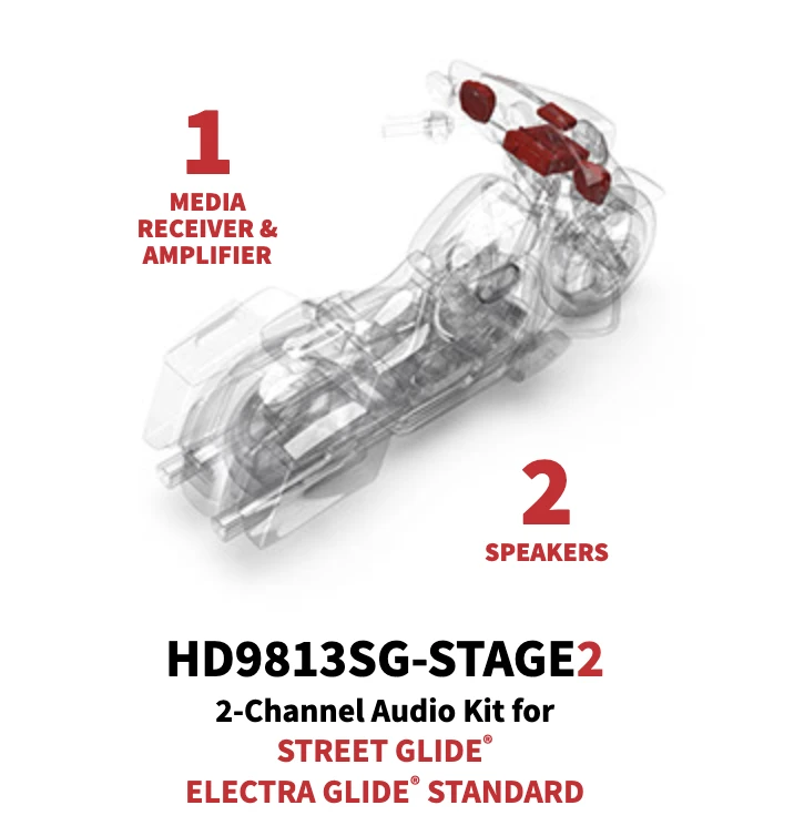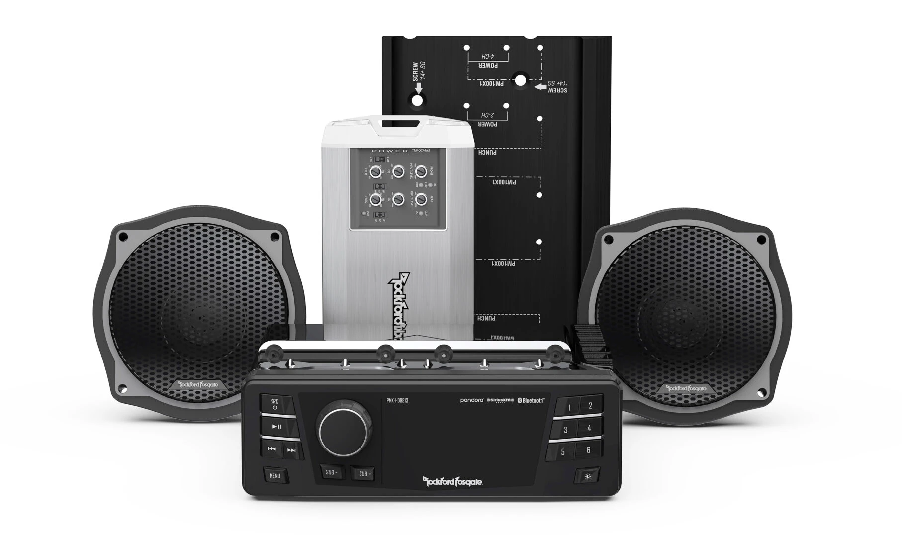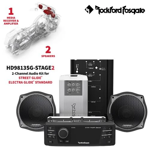 Progettato appositamente per alcuni modelli Harley-Davidson® Electra Glide® e Street Glide® del 1998-2013, questo sistema include un ricevitore multimediale digitale di ricambio, due altoparlanti da 16,5 cm (6.5″) per la carenatura, un amplificatore a 4 canali da 400 watt e un kit di installazione completo.