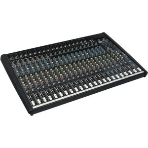 Mixer manuale con gestione di 20 moduli d’ingresso, preamplificatori microfonici D-Pre classe A, connessione USB digitale con iPad/iPod + connessione USB play/rec, doppio banco effetti FX1:REV-X (8 programmi), FX2:SPX (16 programmi), EQ grafico a 14 bande, compressore multibanda, costruzione metallica robusta e pannello connessioni posteriore. Ingressi disponibili: 16 IN microfonici; 24 IN linea (16 mono e 4 stereo); 1 IN talkback. Uscite disponibili: 1 Stereo Bus 2xXLR + 2xJack 6,3; 1 mono XLR; 4 Group Bus 4xJack 6,3; 6 mandate Aux 6xXLR; 1 uscita monitor 2xJack 6,3; 2 uscite matrix 2xJack 6,3; 1 uscita cuffie Jack 6,3; 16 canali insert + 2 per uscita stereo 18xJack 6,3. Gestisce 16 moduli d’ingresso monofonici mic o linea: connessione XLR + Jack 6,3, alimentazione Phantom + 48 V, Pad a 26 dB, HPF a 100 Hz, gain, compressore (solo 8 moduli), EQ a 3 bande, mandate Aux, Pan, accensione canale, attivazione mandata bus (1-2, 3-4, ST) attivazione PFL, slider fader. 2 moduli d’ingresso linea stereo: connessione 2xJack 6,3 o 2xRCA, gain, EQ a 3 bande, mandate Aux, bilanciamento, accensione canale, attivazione mandata bus (1-2, 3-4, ST) attivazione PFL, slider fader. 2 moduli d’ingresso linea stereo: connessione 2xJack 6,3 o 2xRCA, attivazione Ducker, attivazione Leveler, attivazione USB/iPod, guadagno, selettore immagine stereo, EQ a 3 bande, mandate Aux, bilanciamento, accensione canale, attivazione mandata bus (1-2, 34, ST) attivazione PFL, slider fader. 2 moduli effetti: Display LCD, selettore programma effetto, controllo parametro effetto, mandate Aux, accensione canale, attivazione mandata bus (1-2, 3-4, ST) attivazione PFL, slider fader. Alimentatore interno 100-240 V – 76 W. Dimensioni (W x H x D): 819 x 169 x 565 mm; Peso: 15,5 kg.